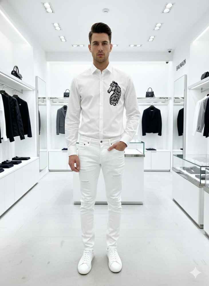Elevate your wardrobe with the Premium Shirt from Vogue Mine. Made with the finest quality cotton, this shirt features intricate Balmain embroidery that adds a touch of luxury to any outfit. Perfect for both casual and formal occasions, this shirt is a must-have for any fashion-forward individual.