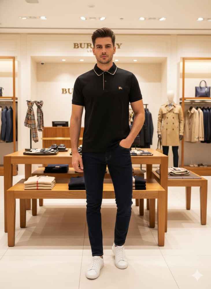 iscover elegance with Premium Polo T-shirt from Vogue Mine. This timeless piece features a sleek black finish, highlighted by Burberry's iconic embroidered logo. Crafted from premium materials, it ensures superior comfort and a perfect fit. Elevate your wardrobe with this luxurious, versatile polo, ideal for any sophisticated, modern look.