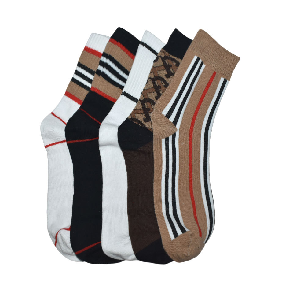 "These Burberry Premium Quality Ankle Socks are expertly crafted with the highest quality materials, ensuring comfort and durability. With a pack of 5, you'll have a pair for every day of the workweek. These socks are perfect for any occasion and provide a touch of luxury to your wardrobe."