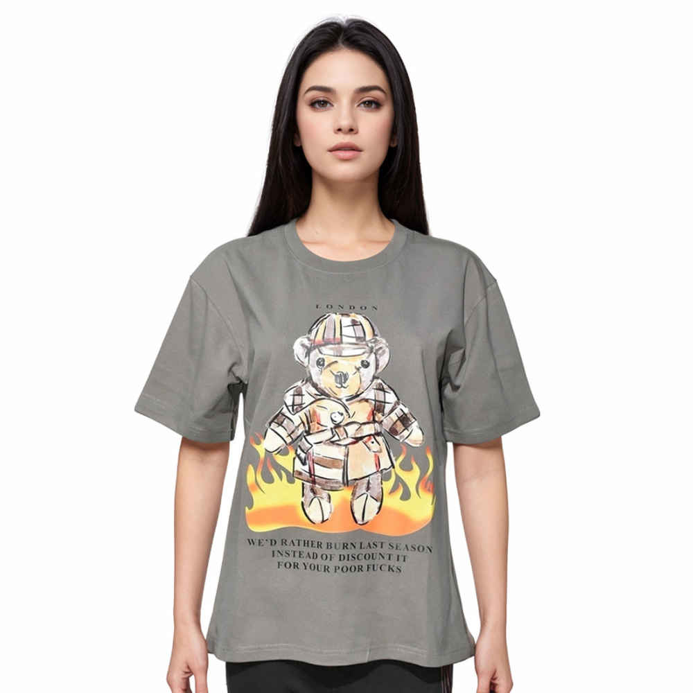 The Burberry Teddy Print Grey Oversized Women's T-Shirt from Vogue Mine will elevate your look. With its whimsical teddy bear pattern, this stylish t-shirt will lend a whimsical touch to your outfit. Its soft fabric and oversized fit guarantee all-day comfort, and the timeless grey hue easily goes with any ensemble.