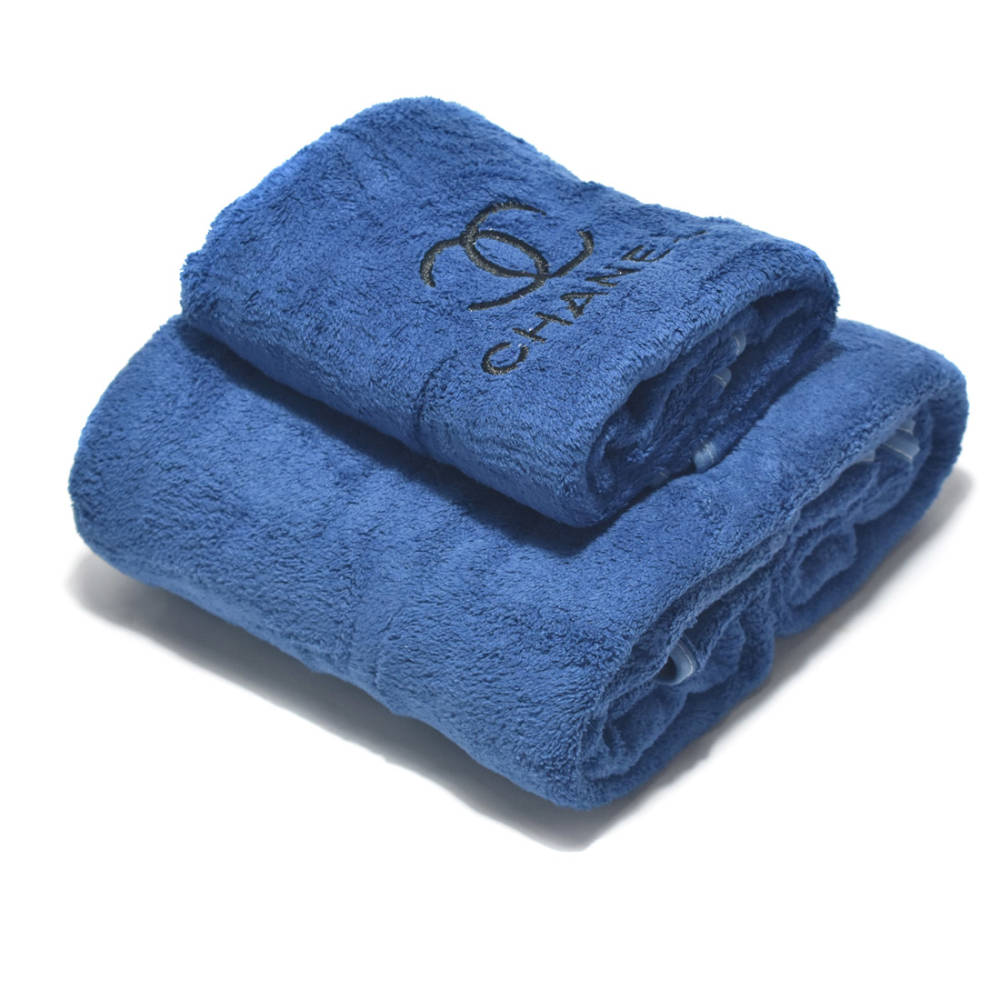 The Chanel Embroidered Logo Dark Blue Towels - Set of 2 from Vogue Mine will enhance the look of your bathroom. These plush towels, which are made of opulent, absorbent cotton and have an exquisitely embroidered emblem, elevate your everyday routine. This beautiful pair is a must-have for every discriminating consumer because they seamlessly blend high-end fashion with utility in any stylish situation.