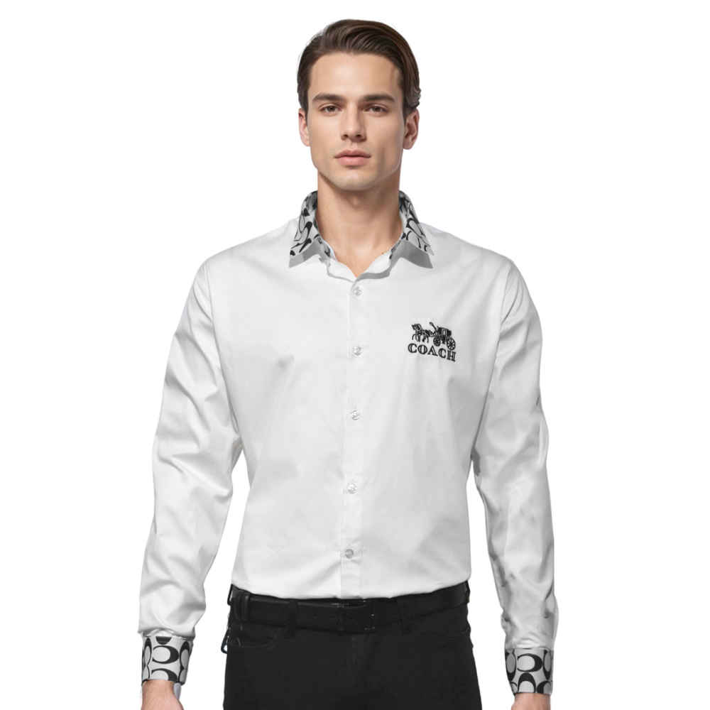 The Coach Logo Print White Premium Cotton Shirt from Vogue Mine will elevate your outfit. This shirt, which is made of fine cotton, is comfortable and classic in look. It looks elegant when the recognizable Coach emblem is added, making it appropriate for both formal and informal settings. Take in the perfect balance of sophistication and quality with this essential piece of clothing.