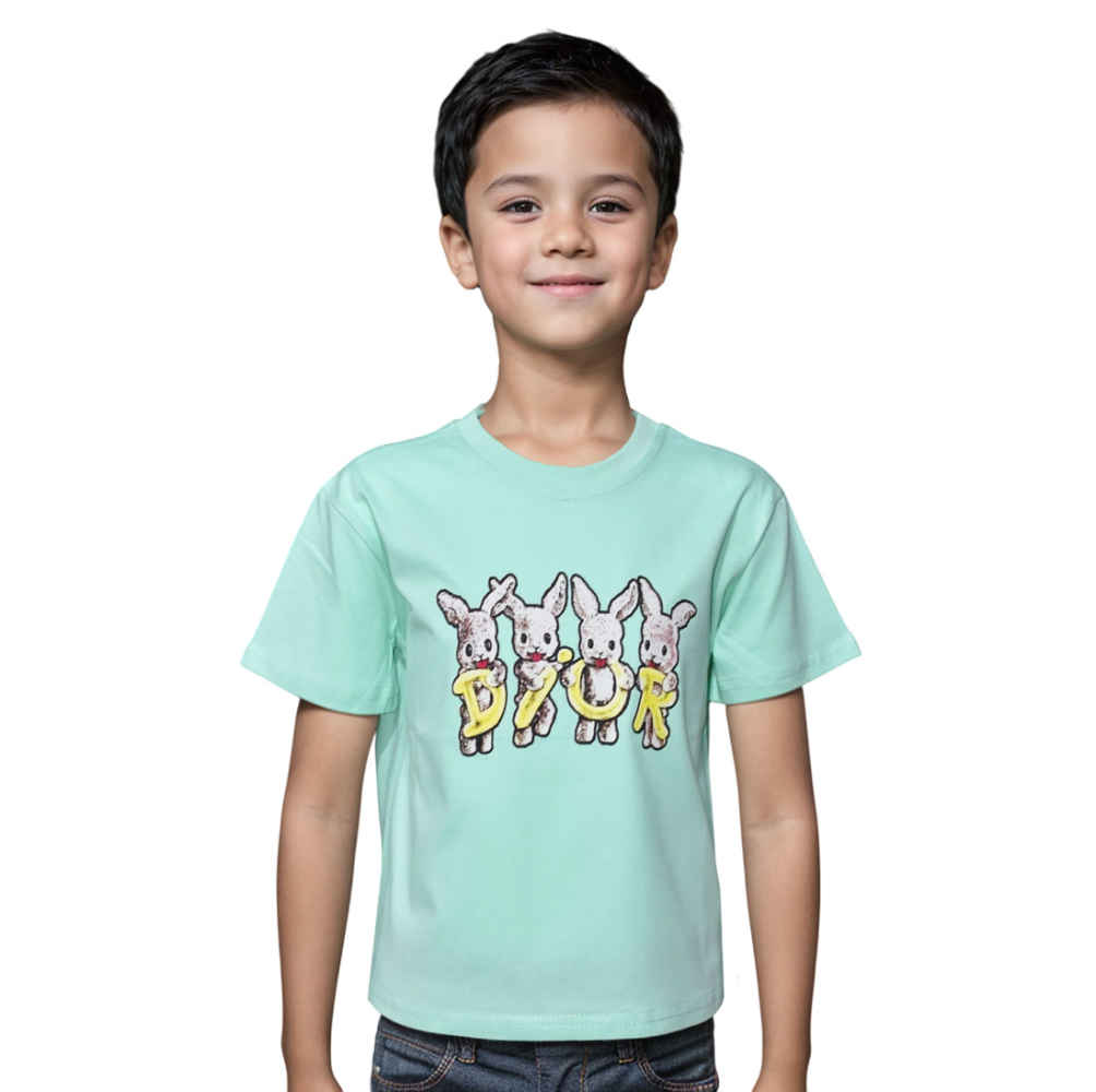 Elevate your child's style with our Dior Rabbit Print Green Premium Kids T-shirt. Crafted with the finest materials, this tee blends comfort and luxury. The playful rabbit print adds a touch of charm, while the vibrant green hue ensures your little one stands out. Perfect for any occasion. Exclusively at Vogue Mine.