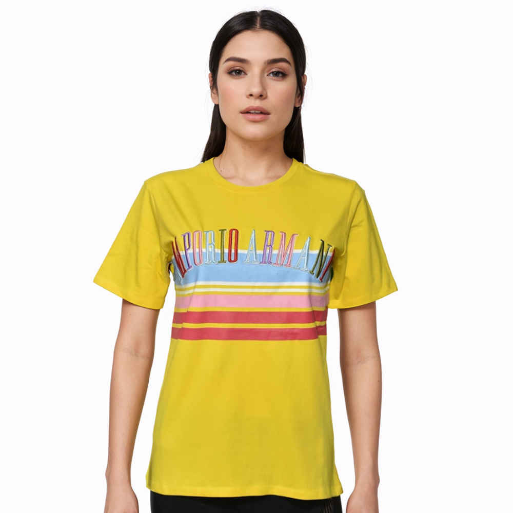 Effortlessly elevate your wardrobe with the Emporio Armani Yellow Premium Quality Women T-shirt. Made from high-quality materials, this t-shirt boasts superior comfort and style. The perfect addition to any outfit, its versatile design and flattering fit make it a must-have for women who value quality and fashion.