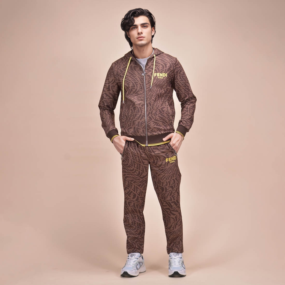Expertly crafted for men, the Fendi Brown Premium Quality Track Suit boasts superior design and comfort. Made with premium quality materials, this tracksuit is perfect for any active man looking for both style and functionality in their workout attire. Experience the luxury of Fendi with this must-have tracksuit.