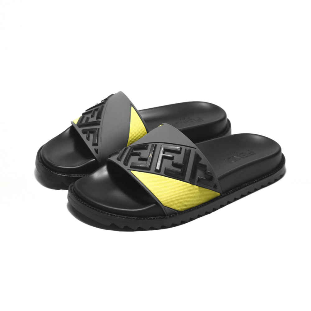 Fendi Embossed Logo Grey & Yellow Premium Flip-flops from Vogue Mine. These chic sandals feature a striking embossed Fendi logo, blending style and comfort effortlessly. The grey and yellow design adds a trendy touch to any outfit, making them perfect for casual wear. Elevate your footwear game with these premium, fashion-forward flip-flops.