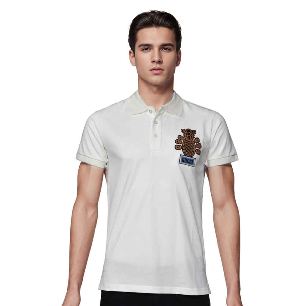 Gucci Pineapple Print White Premium Polo T-shirt from Vogue Mine, you can increase your style ante. This chic polo is made of premium materials and has a whimsical pineapple print that combines elegance with a quirky touch. Ideal for any setting, it provides exceptional coziness and a distinct style. This striking item will give your clothing a dash of refinement and whimsy.