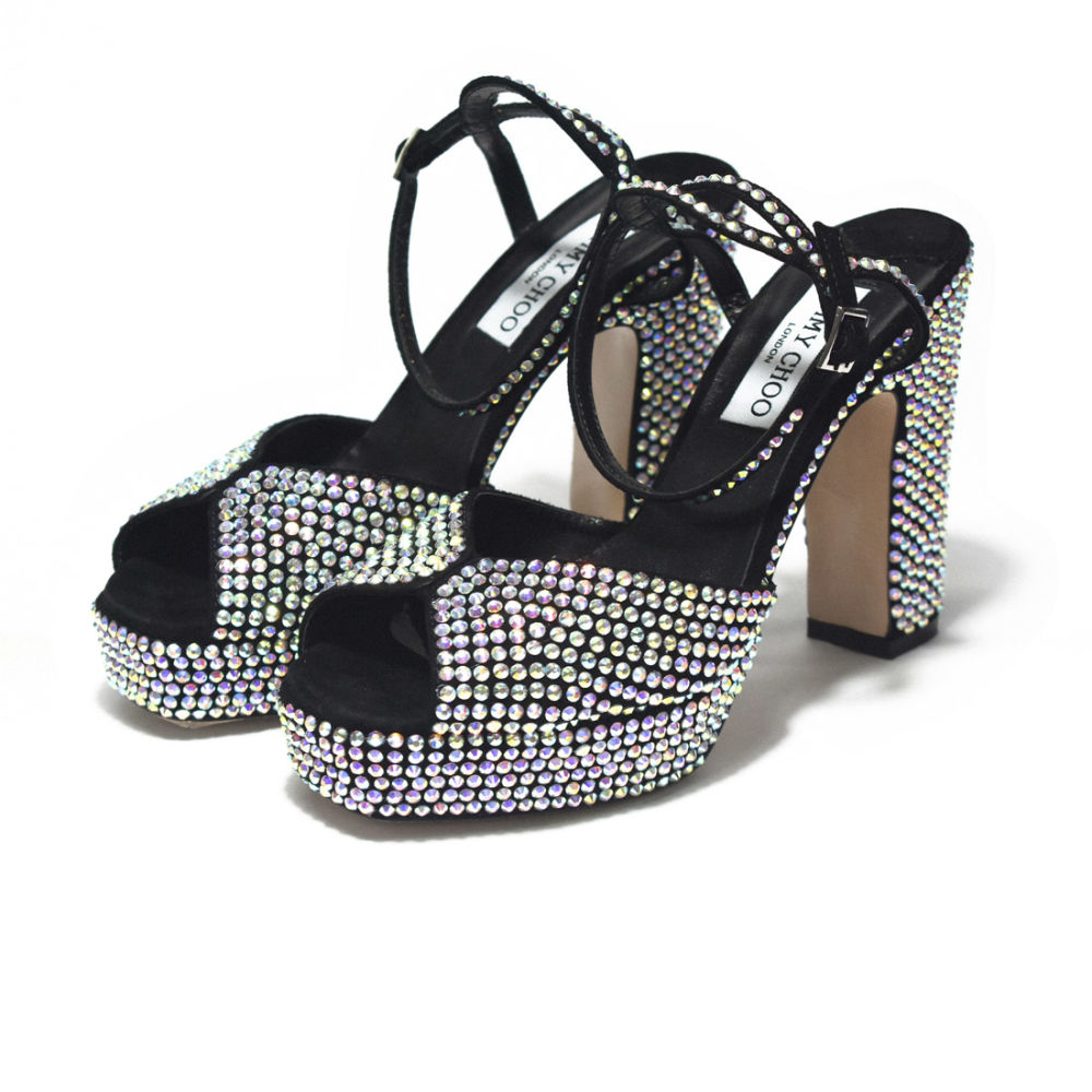 Elevate your style with the Jimmy Choo Sacaria Crystal Embellished Platform Sandals from Vogue Mine. These stunning sandals feature dazzling crystal accents on luxurious fabric, set atop a chic platform. Perfect for special occasions or adding a touch of glamour to any outfit, they effortlessly combine elegance and comfort, making them a must-have addition to your collection.