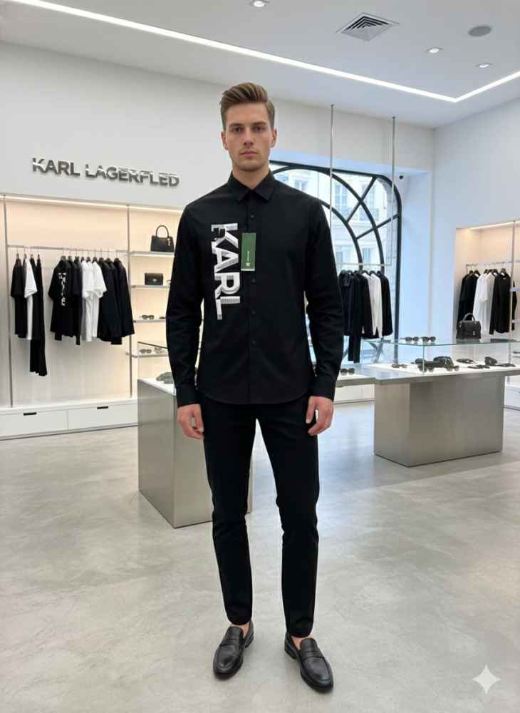 The classic elegance of the Karl Lagerfeld Black Premium Quality Shirt, which is only available online at Vogue Mine, will elevate your wardrobe. This shirt, which is made with high-quality fabrics and meticulous attention to detail, blends elegance and adaptability with ease. Celebrate timeless style with each outfit.