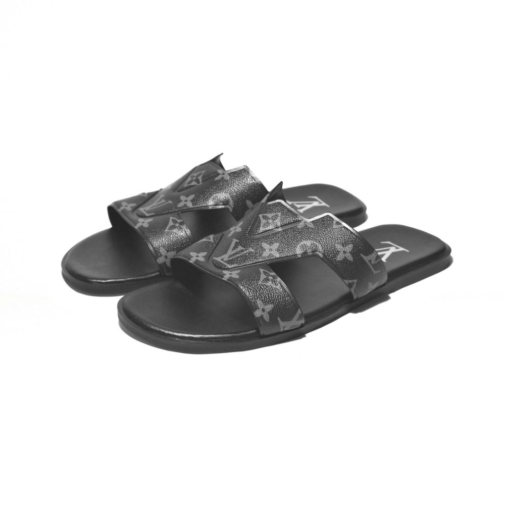 Vogue Mine offers premium black Louis Vuitton men's flip-flops, epitomizing luxury and style. Crafted with exquisite attention to detail, these flip-flops boast unparalleled quality and comfort. Elevate your casual ensemble with these iconic designer sandals, making a bold fashion statement wherever you go. Experience sophistication with every step.
