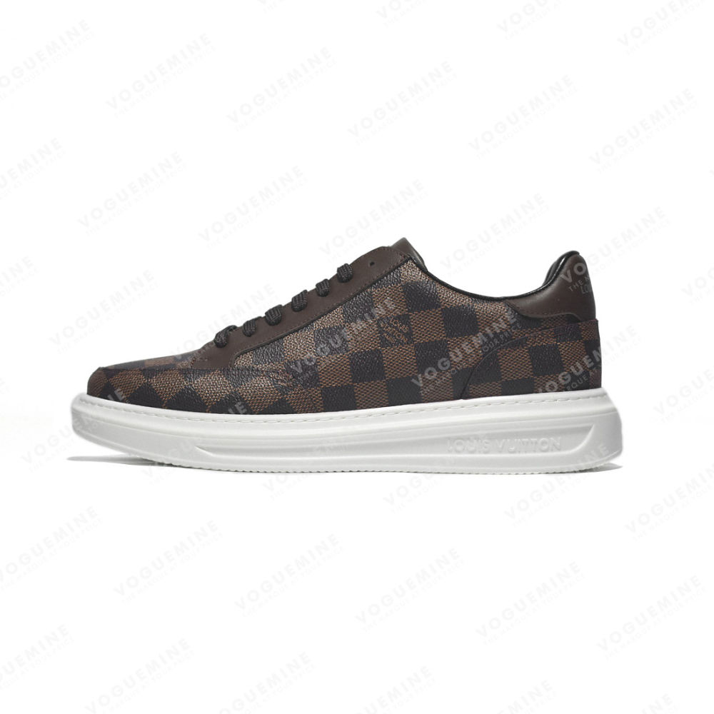 Louis Vuitton's Brown Premium Quality Sneakers are intricately crafted with the utmost care, featuring supple, premium-quality brown leather and a statement LV monogram. Enjoy unparalleled comfort and design with these iconic sneakers.