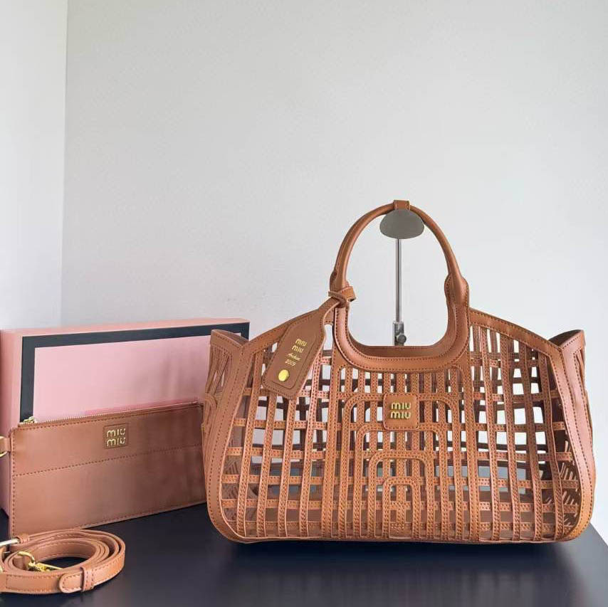 MIU MIU LEATHER TRIMMED LARGE BUCKET BAG WITH UTILITY POUCH INSIDE