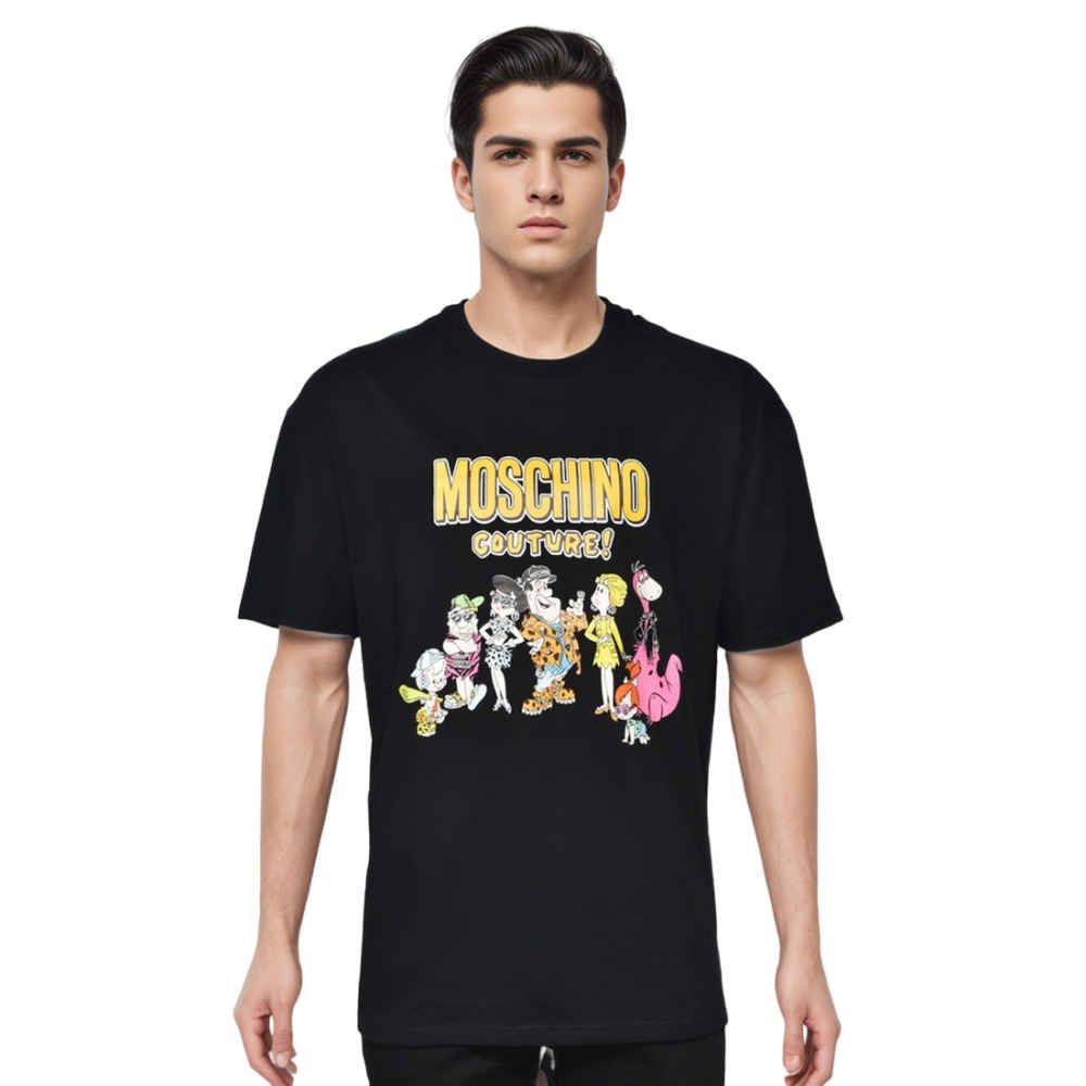 Moschino Couture Flintstone Print Black T-shirt from Vogue Mine. Embrace playful sophistication with this exclusive piece featuring a vibrant Flintstone print, blending high-fashion with a touch of retro charm. Crafted for comfort and style, it's perfect for those who appreciate unique designs that stand out. Elevate your wardrobe with this iconic statement piece, available now for fashion-forward individuals like you
