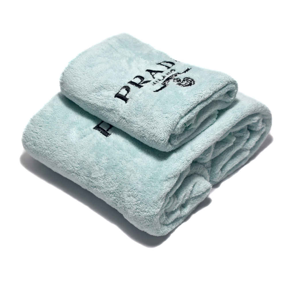 The Prada Embroidered Logo Baby Blue Towels - Set of 2 from Vogue Mine will elevate your bath needs. These soft towels, which are designed for ultimate comfort, have a beautiful embroidered logo that elevates the style of your bathroom. Exceptionally soft and absorbent, they are made from premium materials. Enjoy sophistication and flair with this stylish towel set.