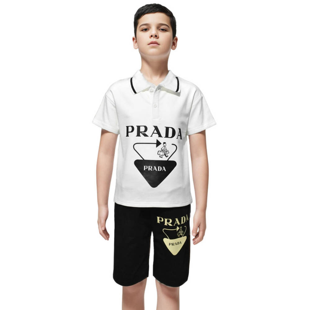 Prada Logo Print Round-neck Kids Co-ord Set from Vogue Mine. This chic ensemble features a trendy round-neck top and matching bottoms, both adorned with the iconic Prada logo. Crafted from premium, comfortable fabric, it's perfect for both casual outings and special occasions, ensuring your little one stands out with luxury and flair.