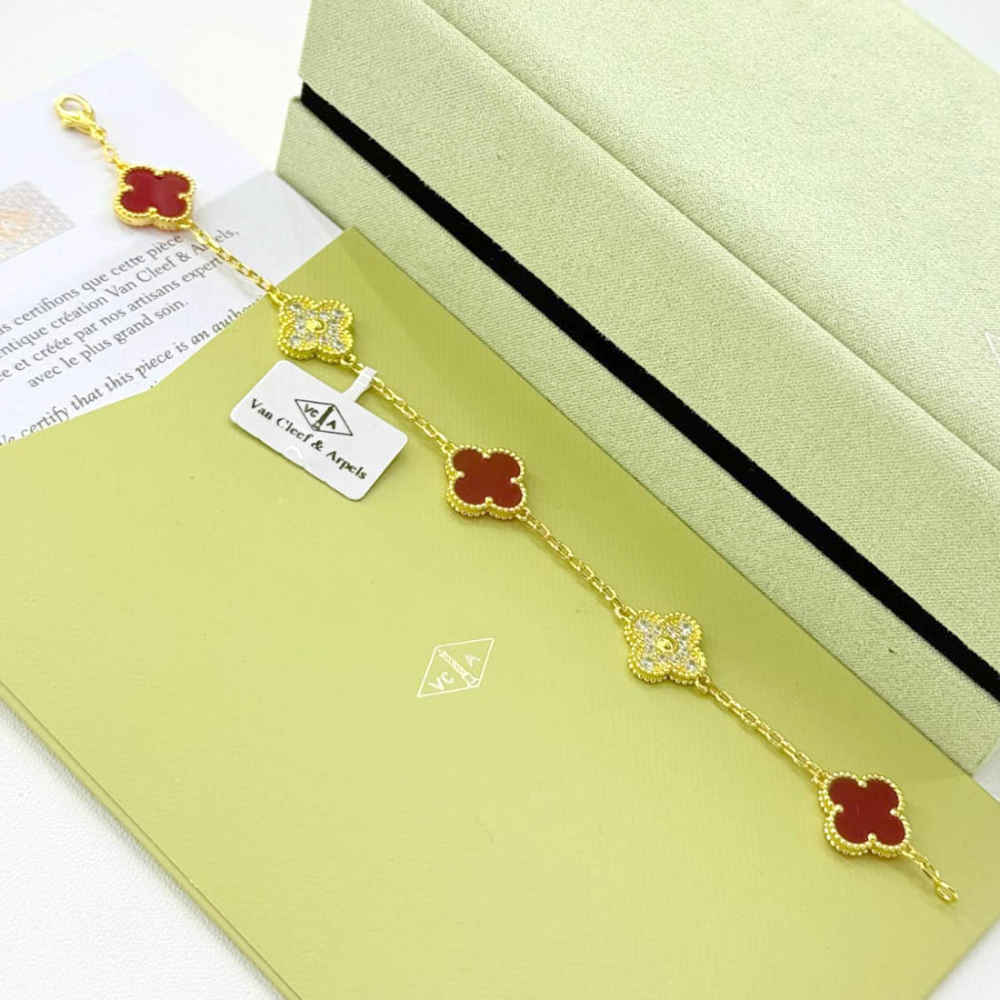 Van Cleef Alhambra Red White Stone Clover Gold Color Bracelet