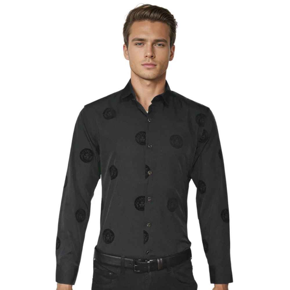 Crafted with premium quality and designed by Versace, this black shirt is a must-have for men seeking sophistication and style. Made with attention to detail, it offers a perfect fit and a sleek appearance that complements any formal or casual look. Elevate your wardrobe with this top-notch designer shirt.