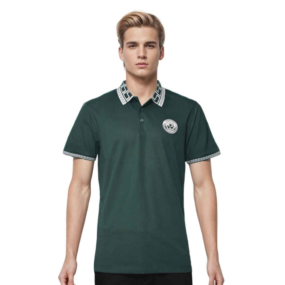The Versace Black Premium Greca Polo T-shirt from Vogue Mine will elevate your look. Crafted from quality cotton for optimal comfort, this sumptuous item includes Versace's classic Greca design. It is a very adaptable addition to your wardrobe because of its sleek black color and precise fit. Ideal for elegant or casual gatherings.