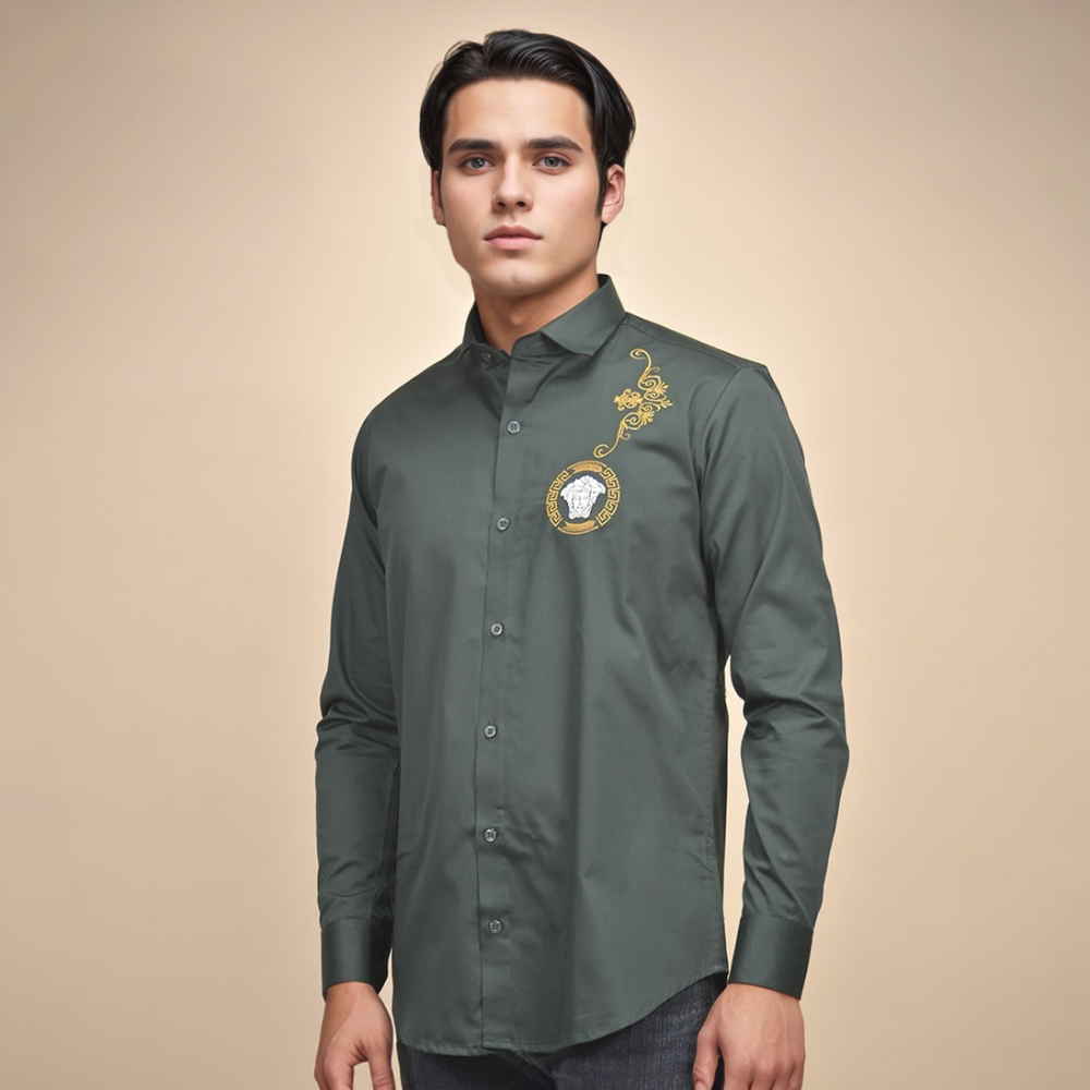 Elevate your wardrobe with the Versace Medusa Embroidered Green Premium Shirt from Vogue Mine. Crafted with meticulous attention to detail, this shirt blends sophistication with bold style. Featuring iconic Medusa embroidery, it exudes luxury and exclusivity. Perfect for formal occasions or adding a touch of opulence to your casual ensemble. Make a statement that's unmistakably Versace.