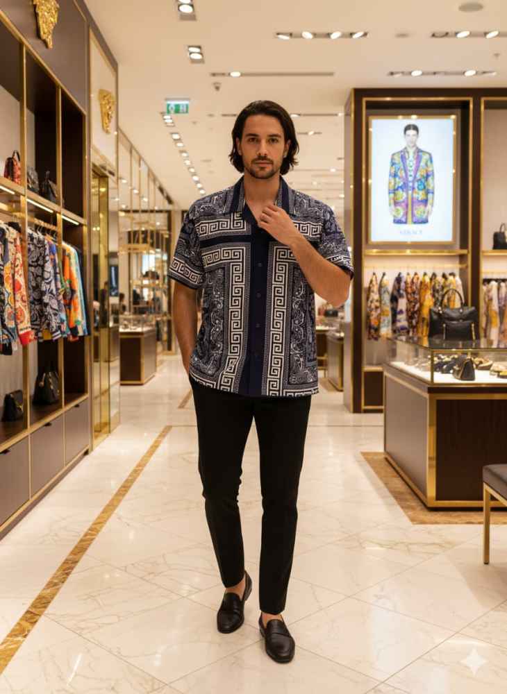 This Versace short-sleeved shirt boasts superior quality and a bold, printed design for the modern man. Elevate your style with this premium shirt, expertly crafted with top-of-the-line materials. Stay cool and comfortable while making a statement. Perfect for any occasion.